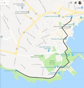 Fiz o passeio de moto, mas pra facilitar, vou mostrar o passeio indo de transporte público. Se estiver de moto ou carro, é só seguir a linha do trem, junto ao mar, que você sai em Cascais. E de lá, siga as instruções que darei mais pra frente.